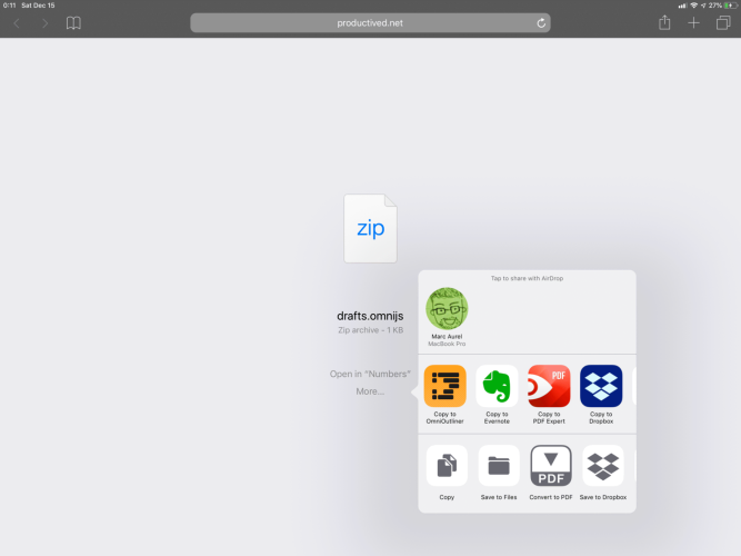 On iOS, click the link. Then, click on the "More..." button below. Lastly, select "Copy to OmniOutliner". You may need to scroll to the right to actually find the entry "Copy to OmniOutliner". This will copy the script into the app and install it accordingly.