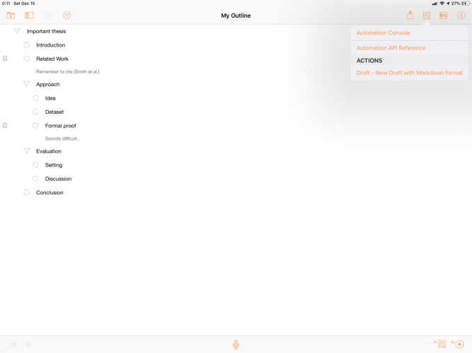 In the following, I will showcase one way to use OmniJS, by creating a Markdown-like document from an outline, and exporting it to another app. The scripts works on both iOS and macOS.