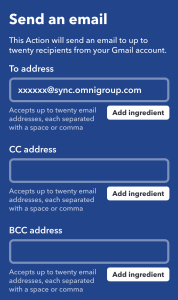 Creating the automation is almost done! The most important field is “To address”. Make sure to add the Send-To-Inbox address in this field. CC and BCC can be kept free. Lastly, the Subject, Body and Attachment field can be modified as wanted. The “Add ingredient” button shows which information is available by the Pocket trigger. This will vary depending on the trigger used.