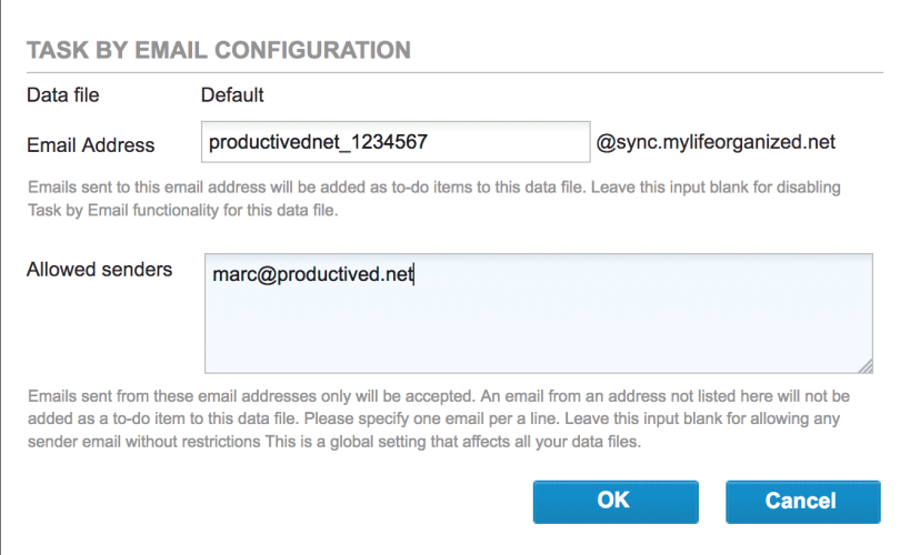 MyLifeOrganized In MyLifeOrganized, this feature is called Task By Email and part of the Cloud Sync subscription service. It is not included into the one-time purchase of MyLifeOrganized on any platform, but available in separate for $1-3 per month depending on the plan. Logged into the website of the Cloud Sync service, the user can create an individual address @sync.mylifeorganized.net for each profile. It is also possible to restrict the allowed senders.