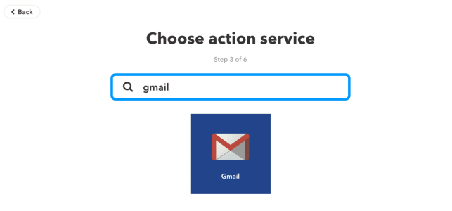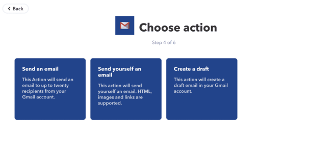 The next screen looks pretty familiar as it goes back to the catch phrase. When clicking on “that”, it will ask for a second service to connect to – the action. This time, we select “Gmail”. Gmail allows three actions, but as the goal is to use Send-To-Inbox, the action of choice will be “Send an email”.