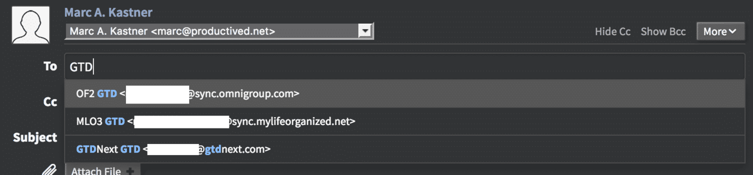 The previously obtained email address can be tested with any email client. Put the address into the “To” field and add a creative email subject. The e-mail subject will be the title of a newly created task. The body of the email will usually be attached as task note if the task management application supports such a thing.