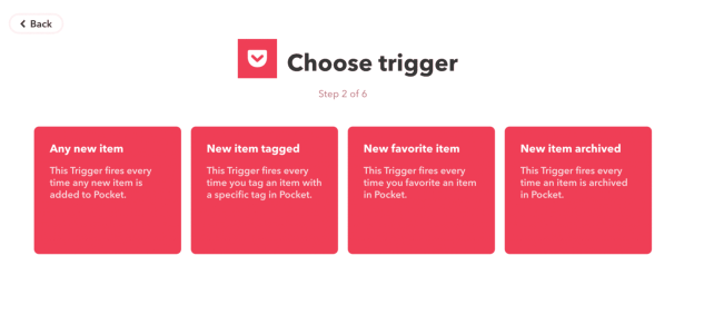 Next, create a new applet. The catch phrase “if this then that” will appear. By clicking on “this”, a menu appears, where you can choose a service of choice – first, the trigger. For the purpose of this guide, we will select Pocket, but feel free to explore all options. For Pocket, there are four triggers available. As the goal is to create a task for each new item, the action of choice will be “Any new item”.