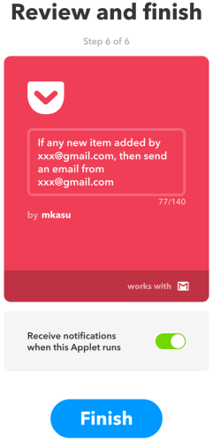 After clicking “Create action”, it will go to the summary screen for a final review. If you proceed to “Finish”, the setup is done. IFTTT will now start to send an Send-To-Inbox email for every new item in Pocket.