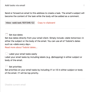Todoist In Todoist, one can create one individual email address per project or Inbox. Going to the settings menu of the Inbox or any individual project, there is an entry to set up the email address. Todoist also supports using some special syntax in the task title to attach meta-data like due dates, priority or labels via Send-To-Inbox.