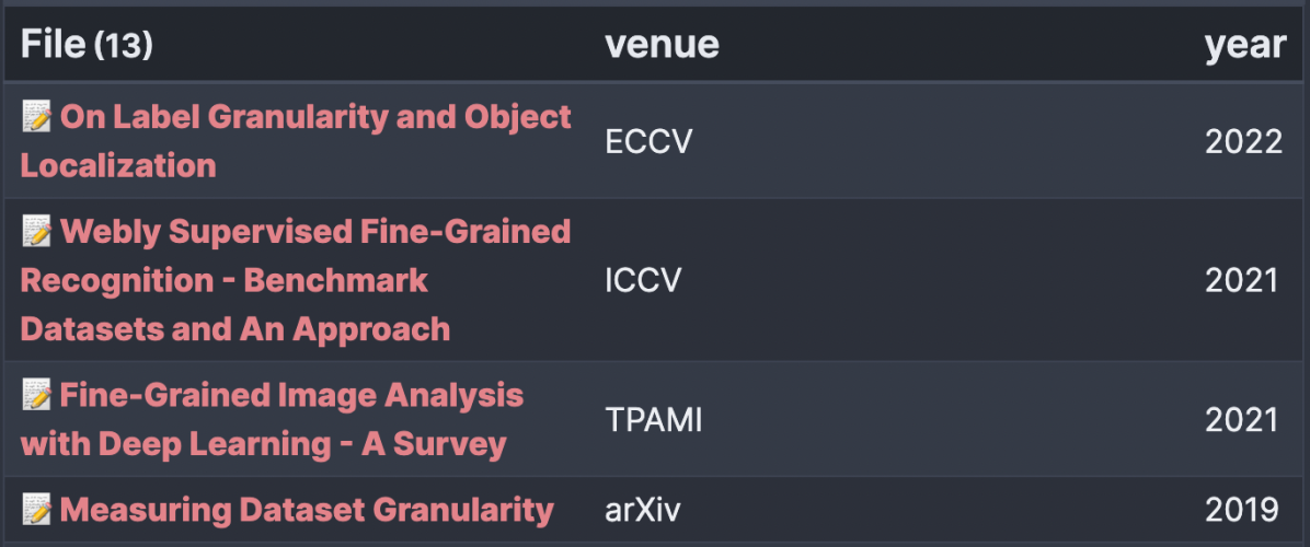 For each note, you can tag it as #literature. Further, you can add some extra information such as year:: 2022 or venue:: CVPR. Now, Dataview allows you to plot out a table of all your relevant notes. Simply create a block like this: