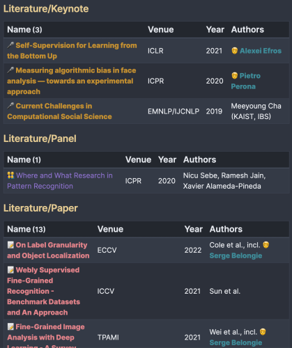 - Above I split Literature into different categories like "Paper"/"Web"/"Video". You can use a similar approach to split them: by author, by year, by venue, by keywords. Actually in my "Literature overview" file, I have multiple such DataviewJS embeddings where I plot it in various ways. This allows for very easy browsing of my note database.